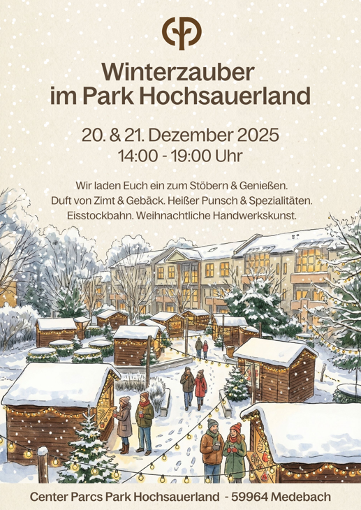Herzliche Einladung zum Winterzauber im Park Hochsauerland! Wann? 20. und 21. Dezember von 14:00 bis 19:00 Uhr Wo? Center Parcs Park Hochsauerland, Sonnenallee 1, 59964 Medebach