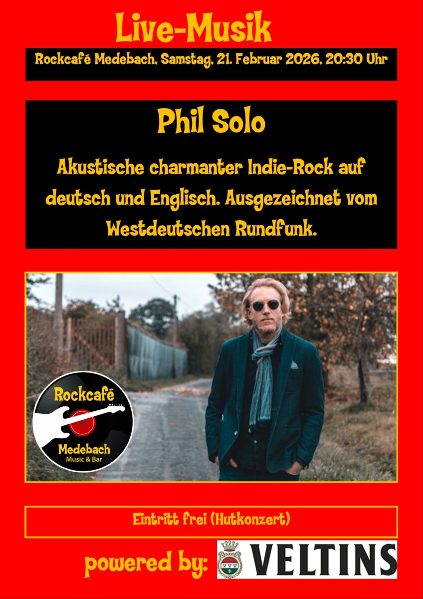 Rockcafé Medebach Marktstr. 1, MedebachAm Samstag, 21. Februar, findet im Rockcafé Medebach das nächste Live-Event statt, dieses Mal mit dem Singer/Songwriter PHIL SOLO. Der vom WDR zum besten Künstler aus Nordrhein-Westfalen gekürte Künstler bietet…